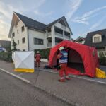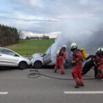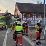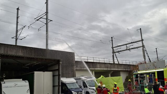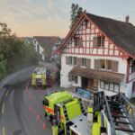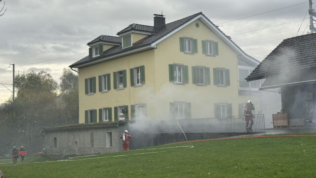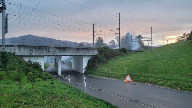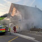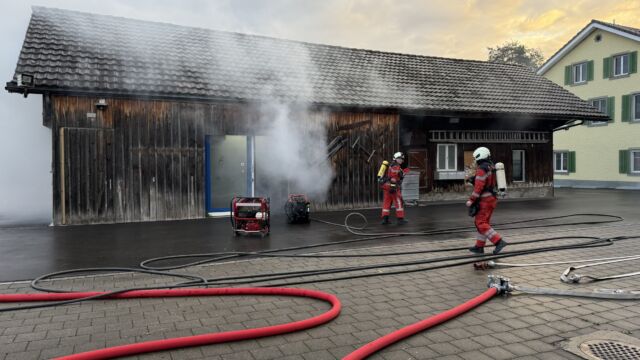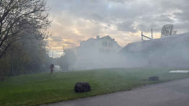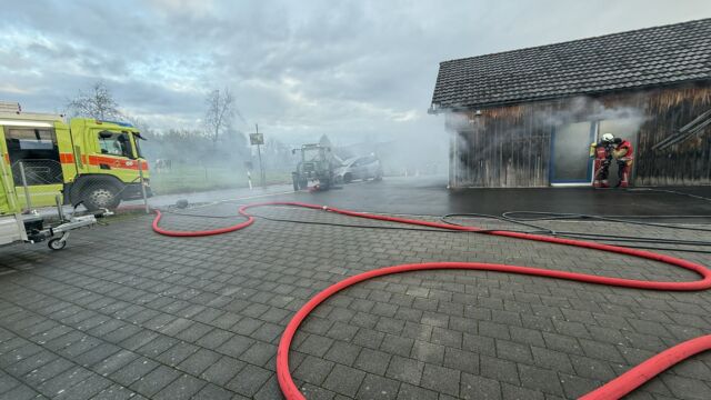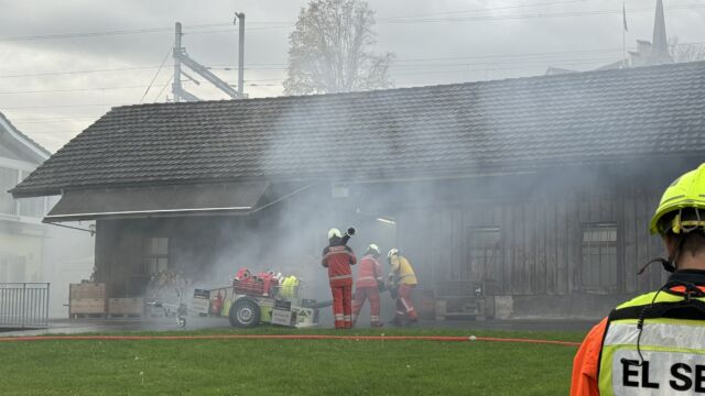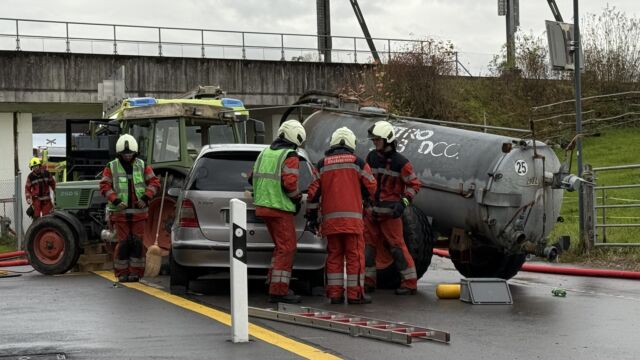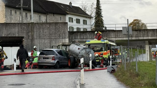 Noch wusste niemand, welches Szenario uns erwarten würde. Bereits auf der Anfahrt war jedoch Rauch sichtbar, und die ersten wurden im Fahrzeug mit Atemschutz ausgerüstet. Vor Ort bot sich dem Einsatzleiter ein anspruchsvolles Lagebild: Im Garten brannte ein Feuer, das über Funkenflug auf das Wohnhaus und eine angrenzende Scheune übergegriffen hatte. Gleichzeitig ereignete sich ein Verkehrsunfall zwischen einem Auto und einem Traktor, bei dem zudem Flüssigkeit austrat. Die Weidlistrasse wurde daraufhin vollständig gesperrt, und mit der Bewältigung der parallelen Ereignisse wurde begonnen. Im weiteren Verlauf musste unter Anleitung der Intervention SBB auch die nahe Bahnanlage gekühlt werden. Insgesamt konnten 13 Erwachsene und 5 Kinder aus Gebäuden und Fahrzeugen gerettet und medizinisch versorgt werden.